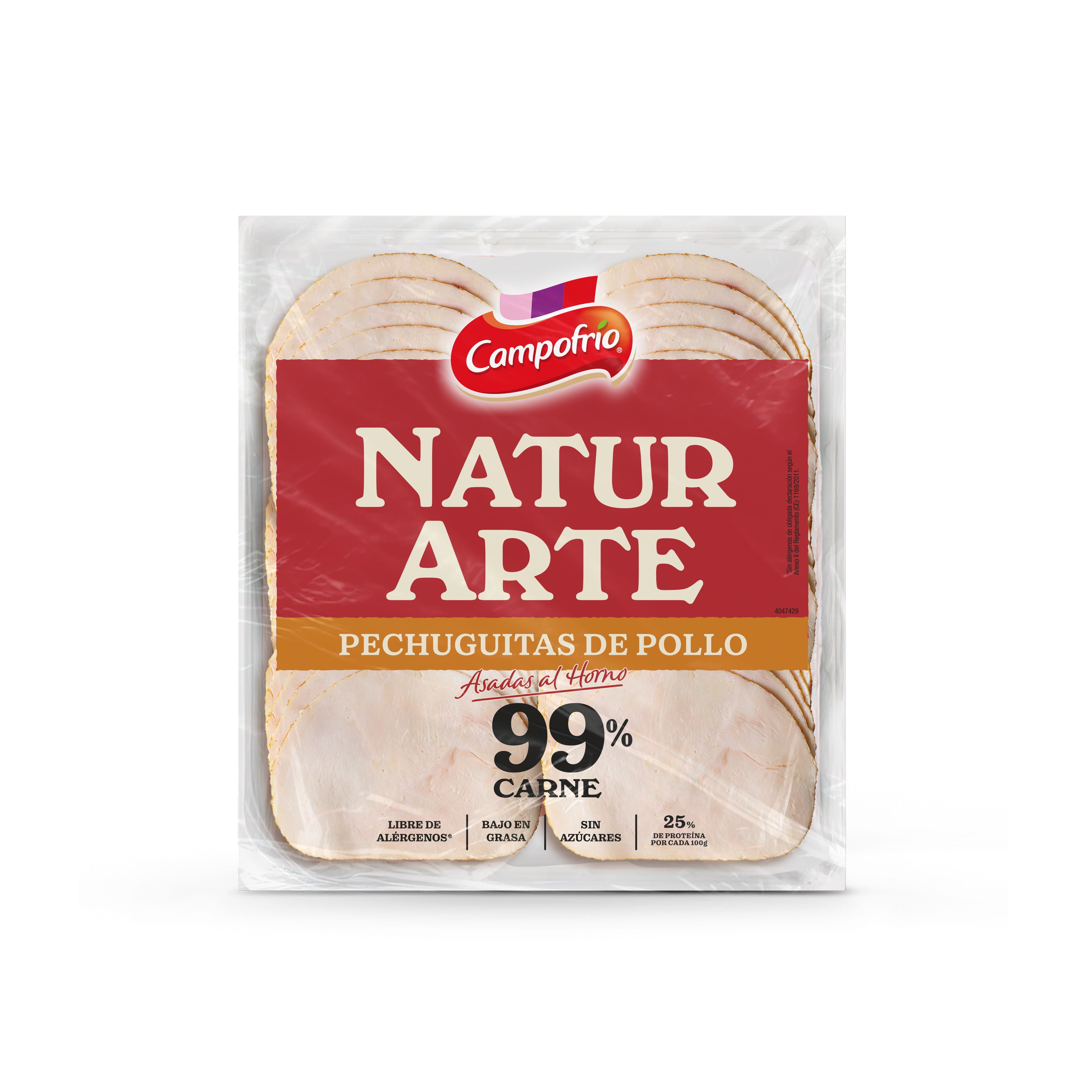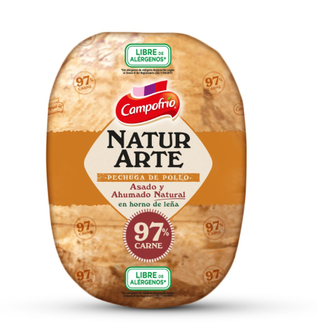 Tras el éxito obtenido en mostrador con las líneas de jamón y pavo cocido NaturArte, Campofrío amplía su catálogo con la nueva Pechuga de Pollo NaturArte 97% carne, elaborada a partir de piezas seleccionadas y sometida a un proceso de asado y ahumado natural en horno de leña, que le aporta un sabor inconfundible. Además, es libre de alérgenos, lo que la convierte en una opción segura para todos los consumidores.