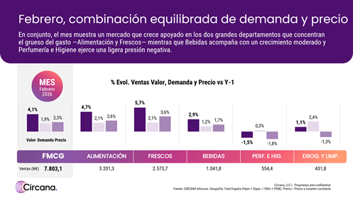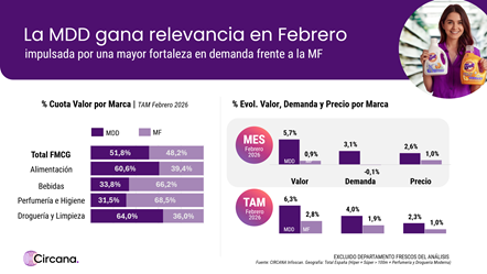 “Febrero mantiene el tono positivo del FMCG, aunque con menor intensidad que el acumulado anual. El consumidor sigue activo, pero decide con más racionalidad: prioriza lo esencial y presta mayor atención al precio. En este contexto, la MDD continúa reforzando su avance y departamentos como Alimentación y Frescos sostienen buena parte del crecimiento del mes”, señala Sandra Latorre, Client Insight Manager de Circana.