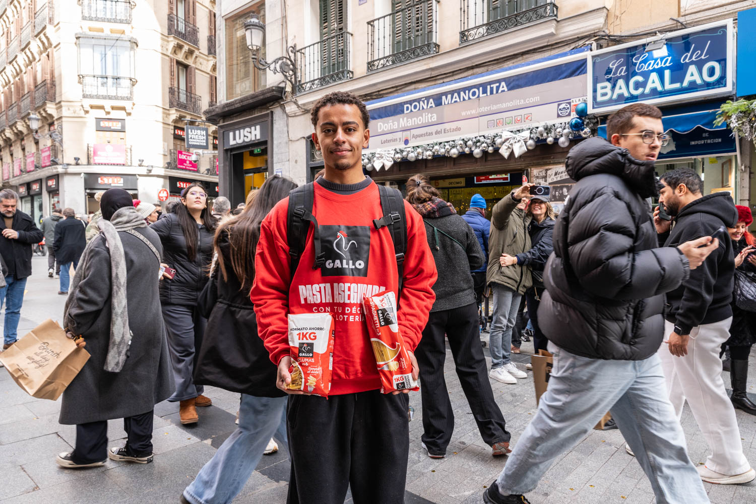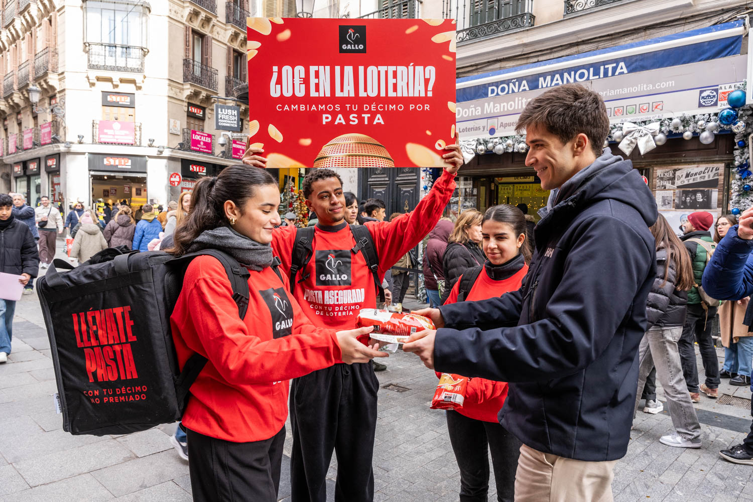Durante la jornada del 22 de diciembre, la acción se desarrolló por las calles del centro de Madrid, ciudad que acoge el Teatro Real y se convierte cada año en el foco del Sorteo de la Lotería de Navidad. En este contexto, Gallo interactuó directamente con los viandantes que no habían resultado premiados, entregándoles packs de pasta a cambio de sus décimos sin premio. De este modo, la marca convirtió esa pequeña decepción compartida en una experiencia positiva y cercana, reforzando su vínculo emocional con el público en un momento especialmente sensible del año.