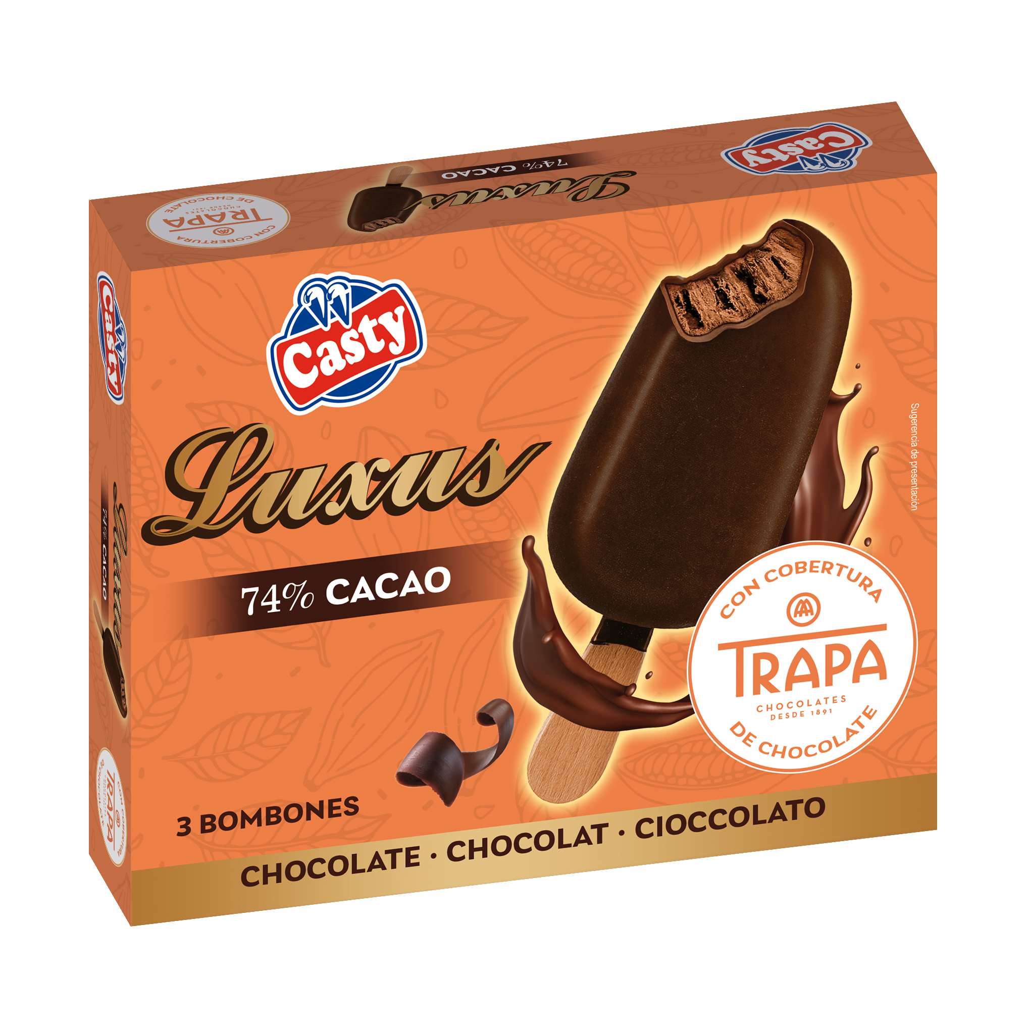 Luxus 74% Cacao by Trapa es un bombón helado elaborado con tres chocolates, relleno de una crema de chocolate negro y recubierto con una cobertura de chocolate Trapa 74% cacao, que aporta intensidad, profundidad y carácter. Un helado concebido para quienes buscan una experiencia intensa y auténtica, donde el chocolate es el verdadero protagonista. Este lanzamiento se integra dentro de la gama Luxus, la línea más exclusiva de Helados Casty, reconocida por su textura más cremosa, la cuidada selección de ingredientes y una cobertura de alta calidad. El resultado es un bombón helado equilibrado y sofisticado, que combina la excelencia del chocolate Trapa con el saber hacer heladero de Casty.