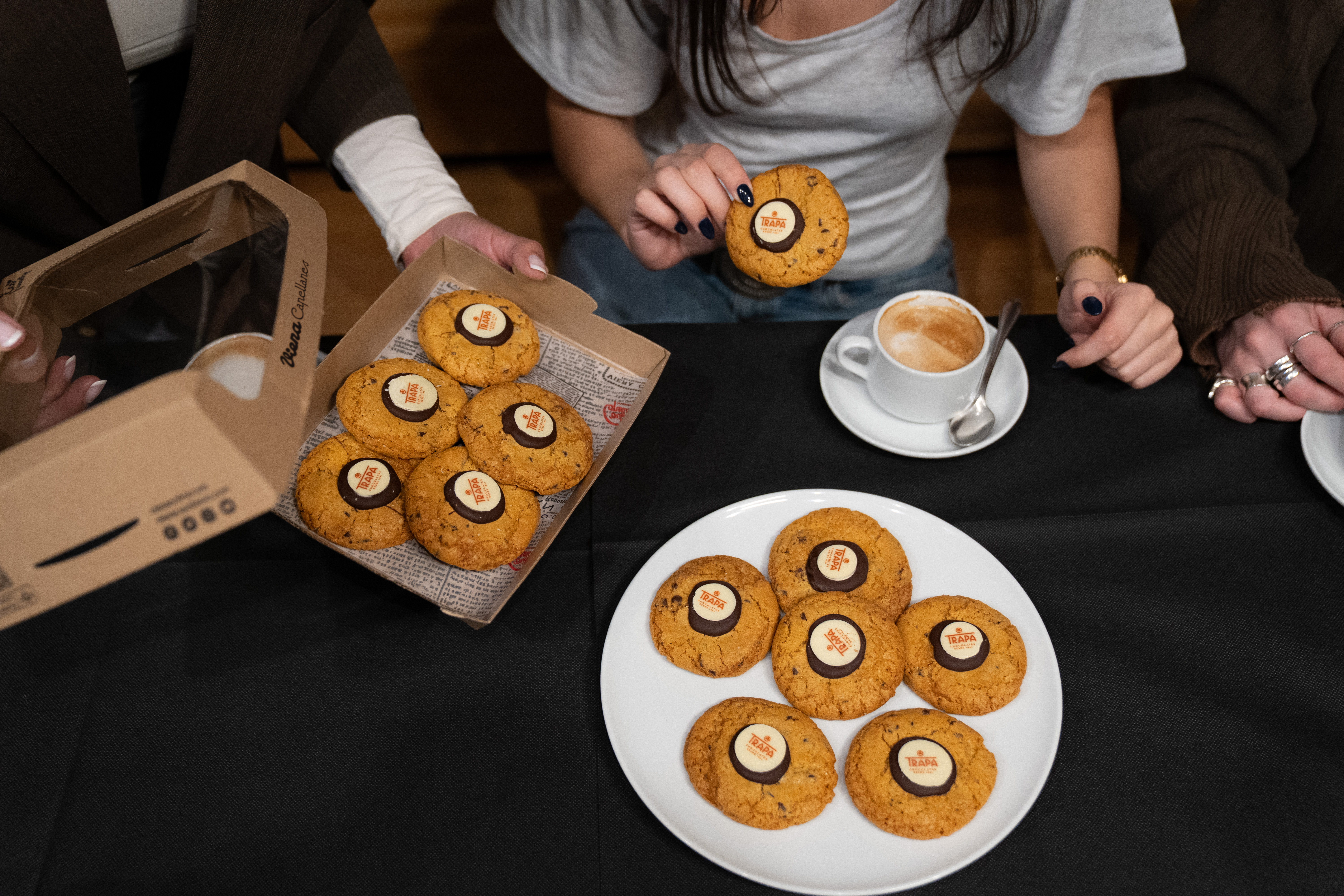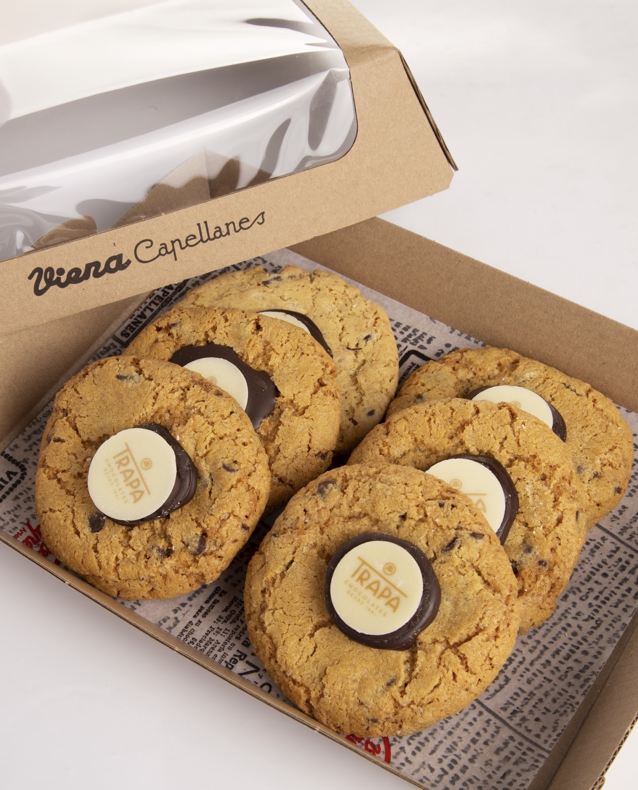 Desde Viena Capellanes, la cookie se ha desarrollado a partir de una receta sencilla y honesta, a base de ingredientes reconocibles –mantequilla, huevos, azúcar moreno…–, una técnica cuidada y un proceso 100% artesanal, casi doméstico, donde cada pieza se moldea a mano antes de hornearse a 170 oC. Una elaboración en la que cada ingrediente cumple su función, buscando ese equilibrio tan difícil entre un exterior ligeramente crujiente y un interior tierno y fundente. En ese equilibrio, el chocolate de Trapa es el gran protagonista. Sus pepitas aportan intensidad, profundidad y un sabor redondo y envolvente que define la personalidad de la cookie. Un chocolate de calidad que se funde suavemente en cada bocado.