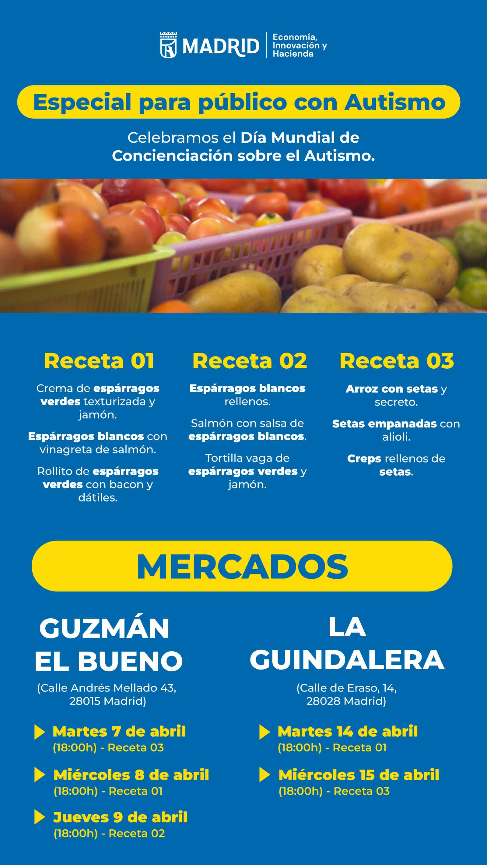 El Ayuntamiento de Madrid, a través del Área de Economía, Innovación y Hacienda, va a poner en marcha una programación especial de talleres de cocina inclusiva con motivo del Día Mundial de Concienciación sobre el Autismo, que se conmemora el 2 de abril. Esta iniciativa, diseñada específicamente para personas con Trastorno del Espectro Autista (TEA), se desarrollará en las instalaciones de los mercados municipales de Guzmán el Bueno y La Guindalera a lo largo del mes de abril.