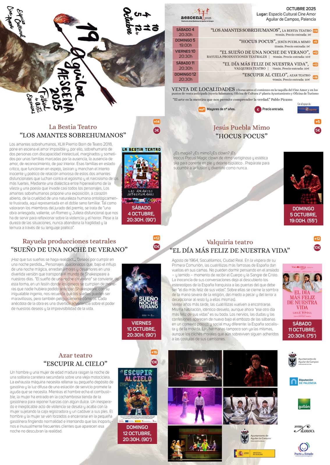 El Espacio Cultural del Cine Amor será la sede del Festival de Artes Escénicas de Aguilar de Campoo, que arrancará el viernes 3 de octubre, con entre otras, diversas sesiones de microteatro. El sábado 4 de octubre a las 20,30 horas se representará la obra “Los amantes sobrehumanos”, mientras que el domingo a las 19 será el turno de “Hocus Pocus – Magic Clown”.