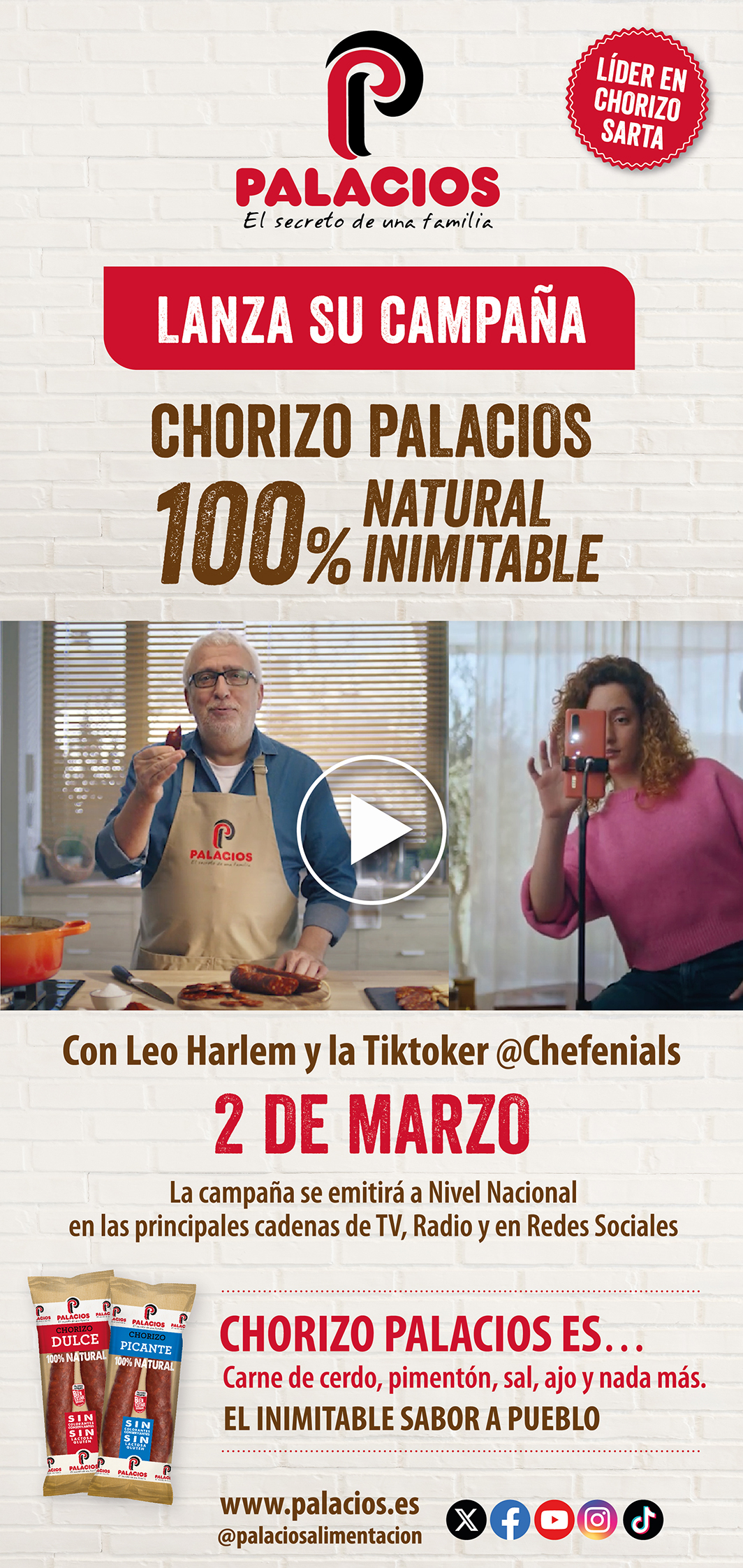 Palacios Alimentación, marca líder en chorizo sarta, lanza hoy 2 de marzo su campaña “Chorizo Palacios, 100% Natural, 100% Inimitable”, con la participación de su prescriptor Leo Harlem y la influencer Chefenials. La campaña tendrá una potente visibilidad a nivel nacional en televisión, radio y redes sociales.