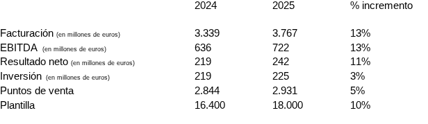 - Gracias a la solidez de su propuesta de valor diferencial, la compañía alcanza una facturación de 3.767 millones de euros en 2025, un 13% superior al anterior ejercicio. A tipo de cambio constante, los ingresos creca en un 16%, consolidando una tendencia de crecimiento a doble dígito por encima del mercado. El resultado operativo (EBITDA) se incrementa también un 13% respecto a 2024, situándose en 722 millones de euros, mientras que el resultado neto del ejercicio crece un 11%, alcanzando los 242 millones de euros.