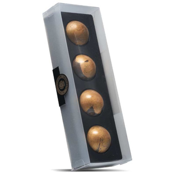 Presentados en una caja transparente, los 4 bombones son perfectos para regalar o compartir. Cada uno combina el intenso chocolate negro con un toque de sal marina y AOVE, en un formato elegante y cuidado.