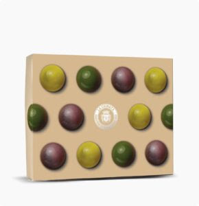 Con una cobertura de chocolate negro y un relleno cremoso de ganache, estos bombones destacan por el toque justo de sal marina y el sabor del AOVE.